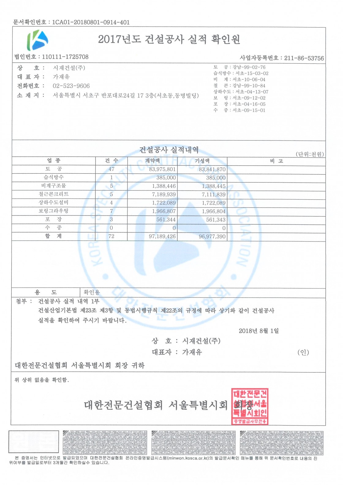 2017년도 건설공사실적확인서 페이지 정보 등록자 관리자 등록일 18-11-03 10:46 조회 3,221 관련링크 이전글 다음글 목록 본문 2017년도 건설공사실적확인서 이전글 다음글 목록