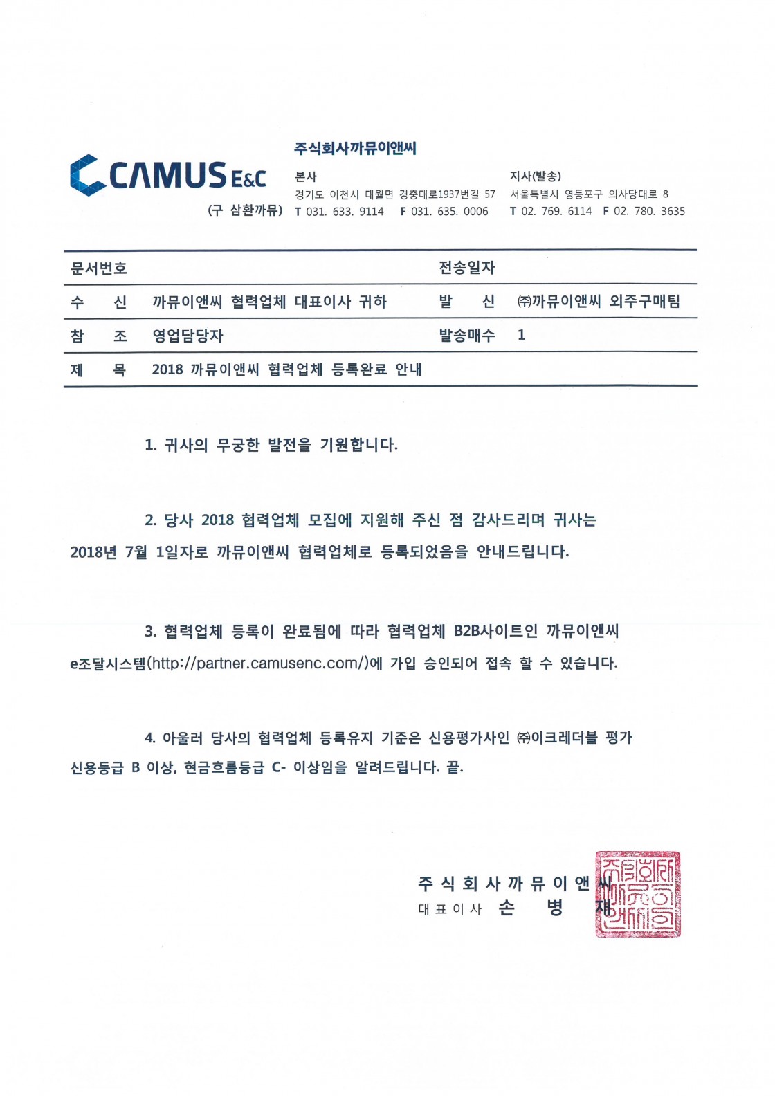 삼환까뮤 협력업체 등록 확인원 페이지 정보 등록자 관리자 등록일 18-09-05 14:20 조회 2,433 관련링크 이전글 다음글 목록 본문 삼환까뮤 협력업체 등록 확인원 이전글 다음글 목록