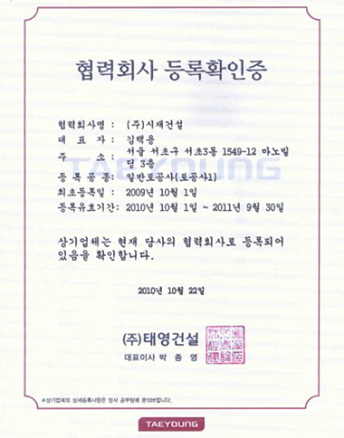 (주)태영건설 협력회사 등록확인증 페이지 정보 등록자 관리자 등록일 18-09-05 14:20 조회 2,764 관련링크 이전글 다음글 목록 본문 (주)태영건설 협력회사 등록확인증 이전글 다음글 목록