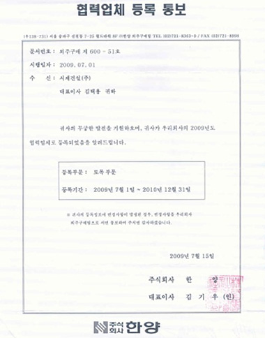 주식회사 한양 협력업체 등록증 페이지 정보 등록자 관리자 등록일 18-09-05 14:21 조회 2,507 관련링크 이전글 다음글 목록 본문 주식회사 한양 협력업체 등록증 이전글 다음글 목록