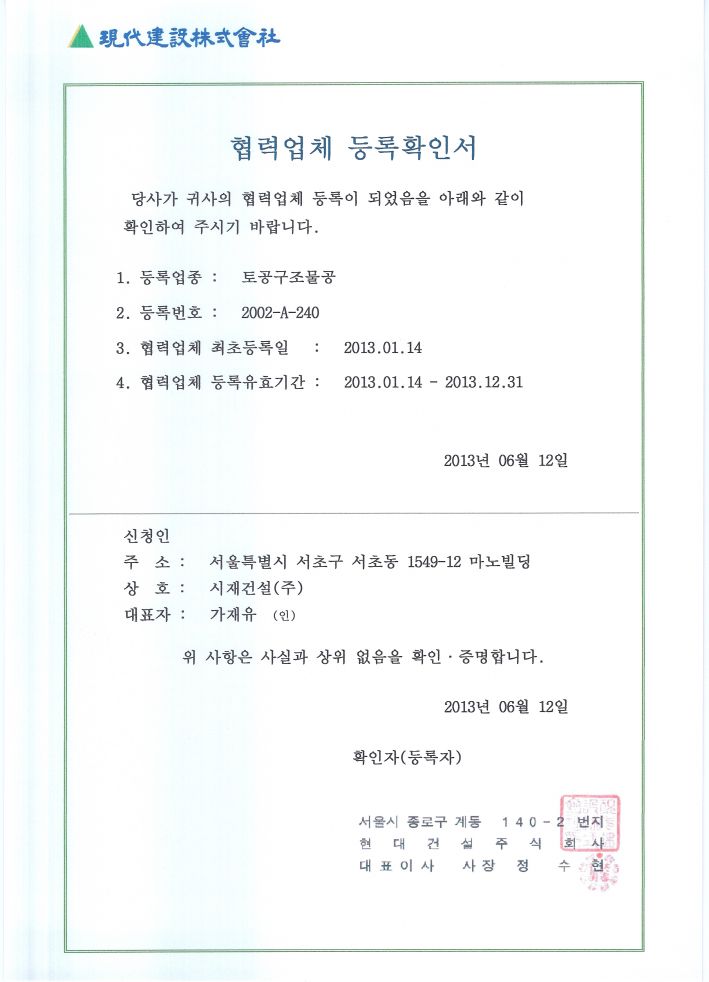 시재건설은 건축토목 부문 공법 기술력을 기반으로한 관련 면허 및 전문 특허 보유 업체입니다.