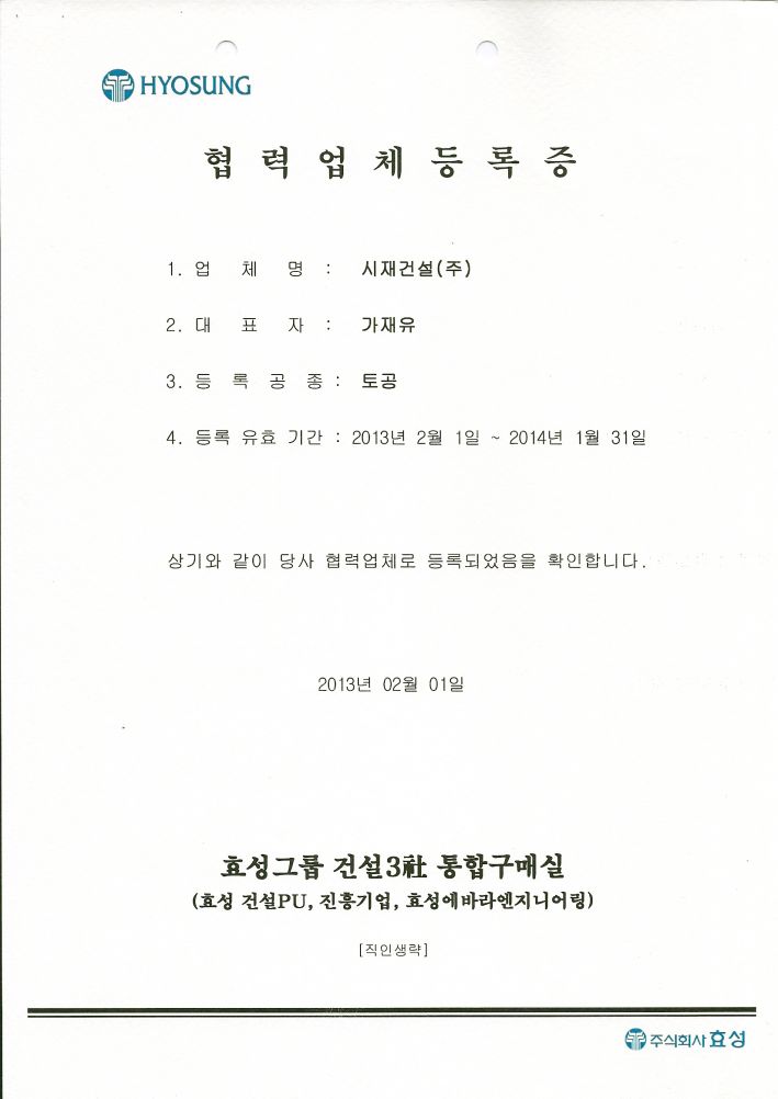 효성건설 협력업체 등록증