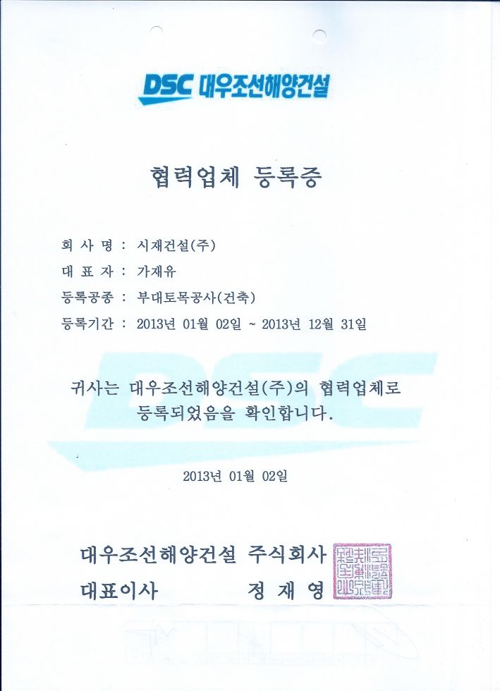 대우조선해양건설 협력업체 등록증 페이지 정보 등록자 관리자 등록일 18-09-05 14:17 조회 2,220 관련링크 이전글 다음글 목록 본문 대우조선해양건설 협력업체 등록증 이전글 다음글 목록