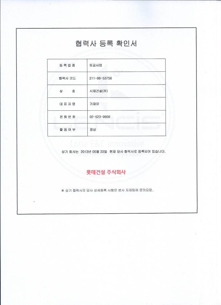 롯데건설 협력업체 등록증