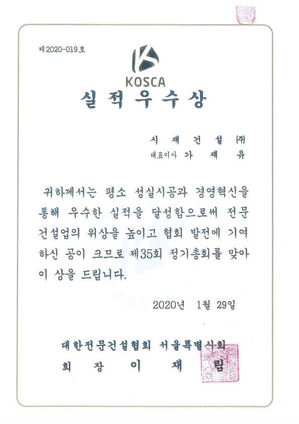 경축알림 | 대한전문건설협회 "실적우수상" 수상 페이지 정보 등록자 관리자 등록일 20-01-29 18:02 조회 11,750 관련링크 이전글 다음글 목록 본문 대한전문건설협회 실적우수상 수상2020년 1월 29일 더욱 열심히 하는 시재건설이 되도록 노력하겠습니다.감사합니다. 이전글 다음글 목록